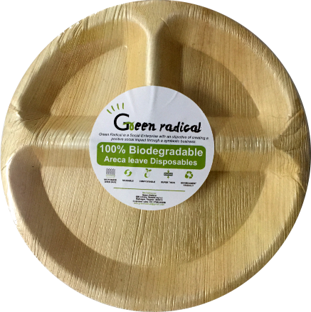 Name: 3 compartment round Code: 3CPR Product detail: 100% Biodegradable Areca leaf plates Size: 10" Pack size:10 MRP: 124/- Material: Areca Leaf Pacakging: 50 micron shrink warp Features:
