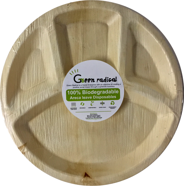 Name: 4 Compartment Code: 4CP Product detail: 100% Biodegradable Areca leaf plates Size: 12" Pack size:10 MRP: 154/- Material: Areca Leaf Pacakging: 50 micron shrink warp Features: